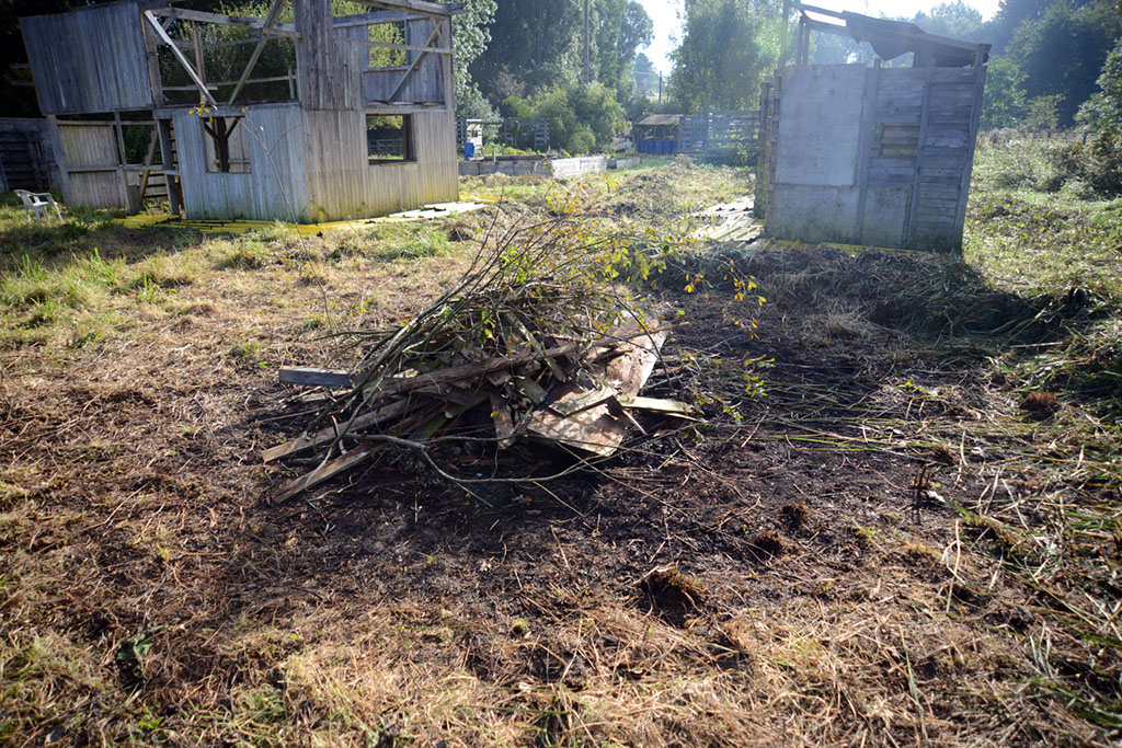 Et voici le théâtre des opération le plus lourdes ! Ici aussi des tas de palettes ont disparu et des nouvelles buttes sont en train de voir le jour grâce à la matière qui résulte du fauchage des environs. Nous gagnons de la place dans la zone "vierge" entre le théâtre et les baraques décors au milieu du terrain. Cet espace fera l'objet des prochaines discussion car nous avons l'intention d'y installer une vaste zone de culture collective en forme de mandala.